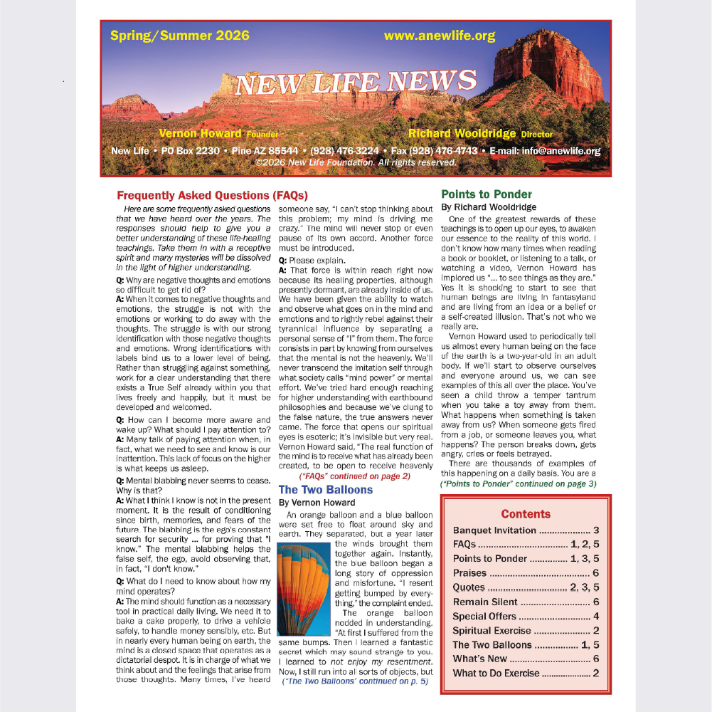New Life is a nonprofit, federally tax-exempt educational, eleemosynary organization founded by Vernon Howard in the 1970s for the distribution and dissemination of a true teaching. It is dedicated to sharing true principles of self-understanding and success as a human being.